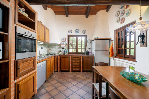 La spaziosa cucina abitabile, collegata alla sala da pranzo, rappresenta il cuore della casa, ideale per preparare e condividere cene in un ambiente informale e familiare.