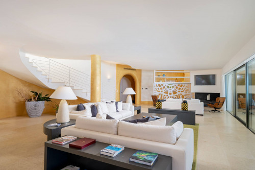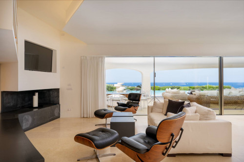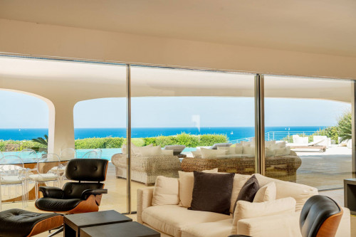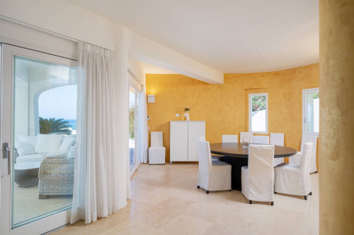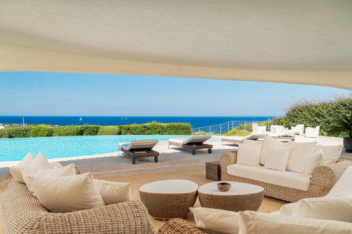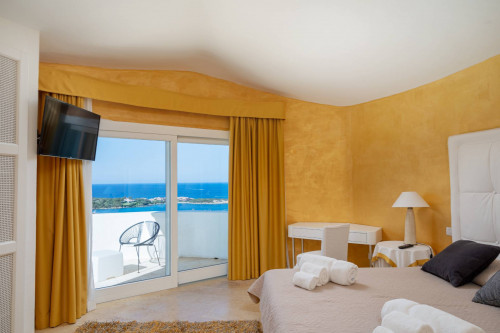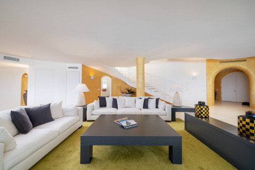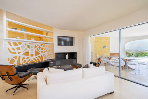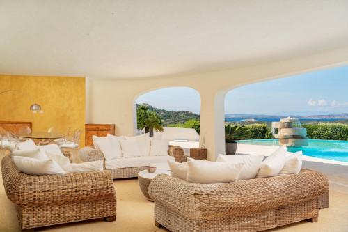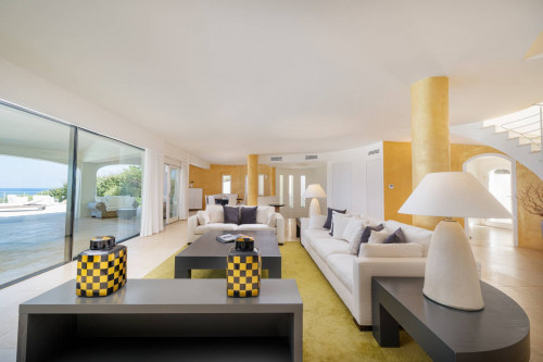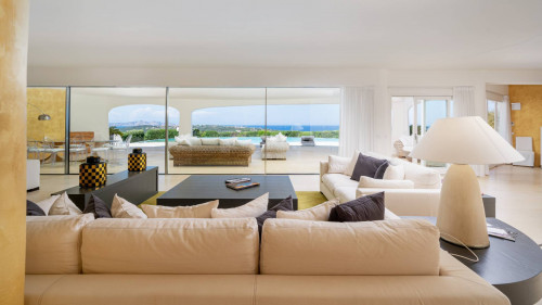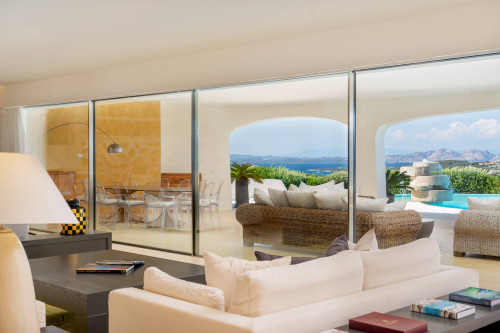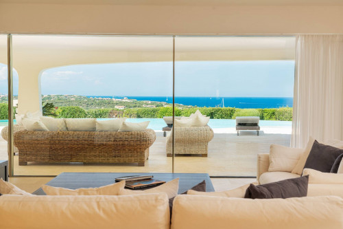 Vista Panoramica e Piscina InfinitiLa Villa è pensata per esaltare la meraviglia del suo panorama spettacolare: il soggiorno e la sala da pranzo si trovano in una posizione centrale, frontalmente orientati verso ampie vetrate, che non solo permettono alla luce naturale di entrare in abbondanza, ma regalano anche una vista panoramica a 360 gradi sulla Marina di Porto Cervo e sul mare cristallino che si estende all'orizzonte. Questo straordinario scenario è accompagnato da una piscina a sfioro, che sembra fondersi con l'acqua del mare, creando una sensazione di totale continuità tra interno ed esterno.