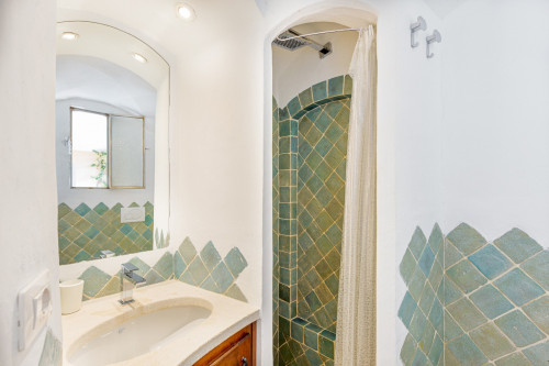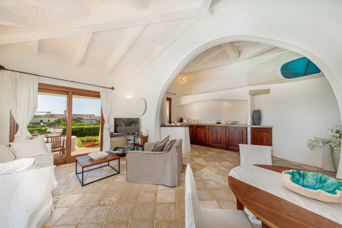 Gli interni, progettati nello stile inconfondibile della Costa Smeralda, uniscono raffinatezza e funzionalità. La zona giorno si apre su un luminoso soggiorno con cucina a vista, caratterizzato da ampie vetrate che incorniciano il mare e lasciano entrare la luce naturale in ogni momento della giornata. Completano questa area un ingresso accogliente e un bagno per gli ospiti.