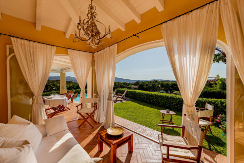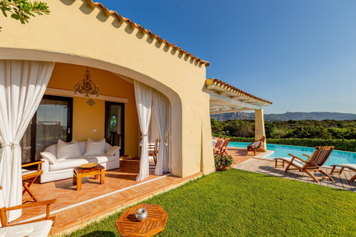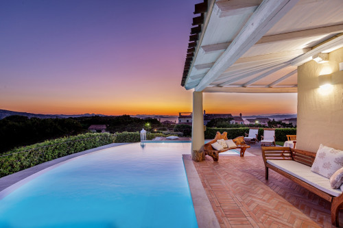 La proprietà è circondata da un curatissimo giardino con prato all'inglese, arricchito da piante e fiori tipici della macchia mediterranea. Al centro spicca una splendida piscina a sfioro con idromassaggio, perfetta per momenti di relax in totale privacy. Diverse verande, pergolati e una grande terrazza panoramica permettono di vivere al meglio gli spazi esterni, regalando spettacolari tramonti e scenari di incomparabile bellezza.