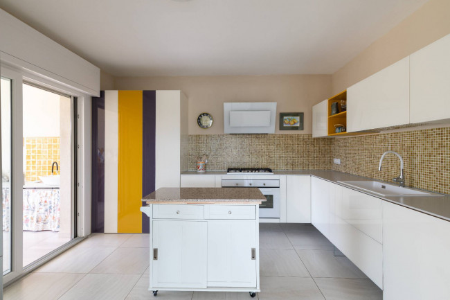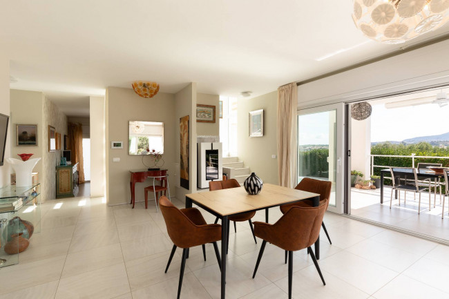 La zona giorno comprende un raffinato salotto, una cucina abitabile di design, una camera con bagno privato e accesso diretto al giardino, oltre a ampie verande e logge panoramiche che si affacciano sulla piscina esterna riscaldata, il vero cuore della casa.